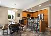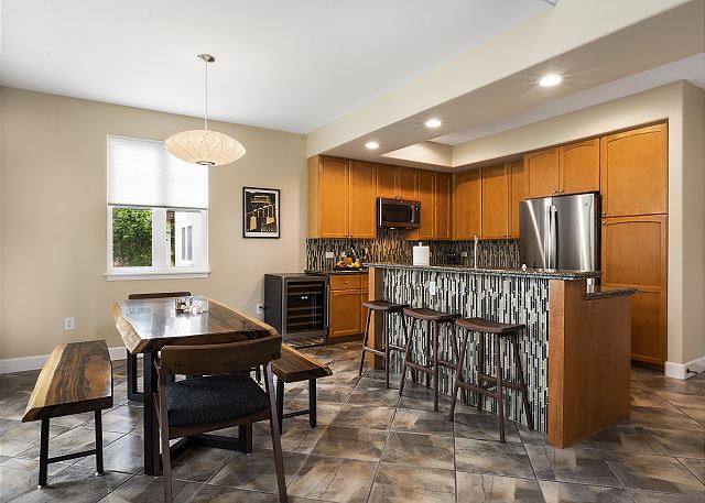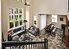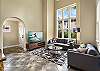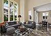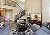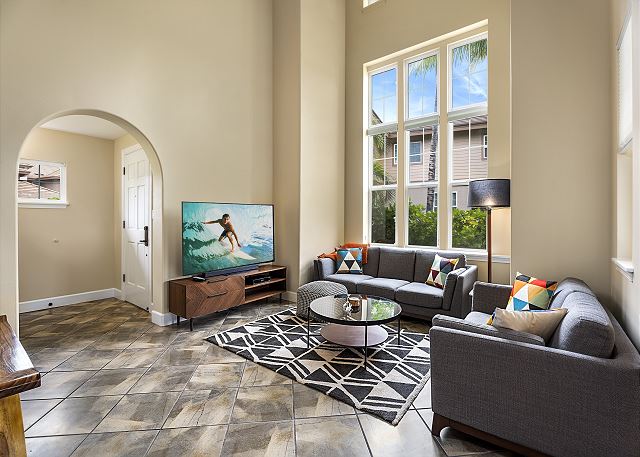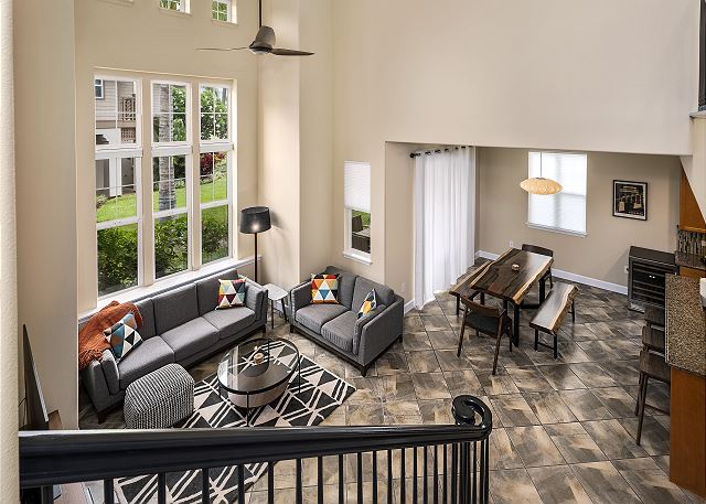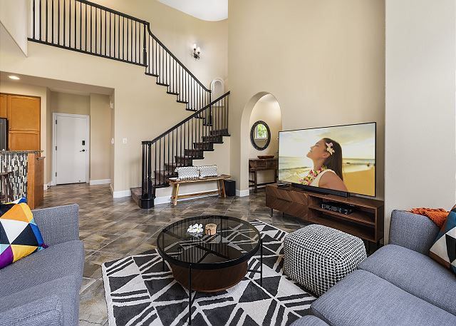 1階には広々としたリビングルームがあり、吹き抜けの天井は心地よい風を感じていただけます。ゆったりくつろげるソファとフラットスクリーンテレビが備わっており、リラックスムード満点。料理好きの方には、機能的で広々としたキッチンも嬉しいポイントです。ご家族でワイワイ楽しめますね。
