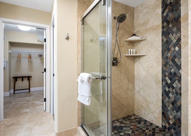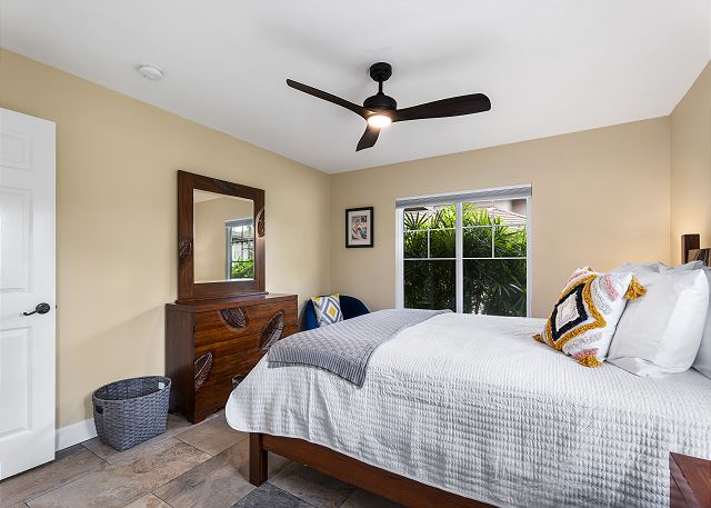 2階にはキングサイズベッドと薄型テレビが設置されたマスターベッドルームがあり、専用のバスルームやプライベートラナイで優雅な時間をお過ごしいただけます。また、ゲスト用ベッドルームにはクイーンベッド1台があり、隣接するバスルームでプライベートも保たれた快適さが嬉しいですね。