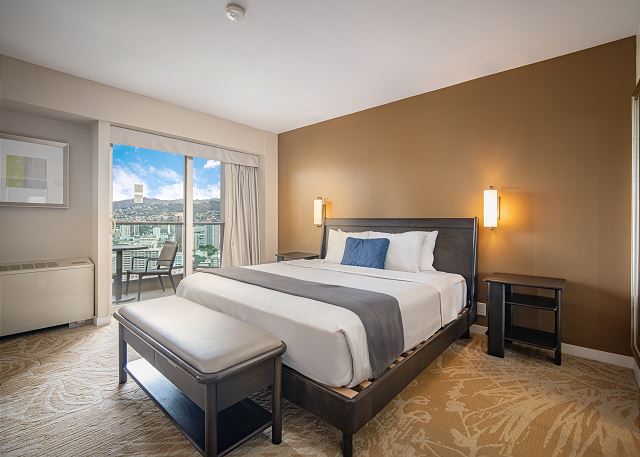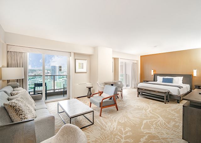 お部屋からは美しいシティビューが広がり、ラナイ(バルコニー)からは一部オーシャンビューもお楽しみいただけます。