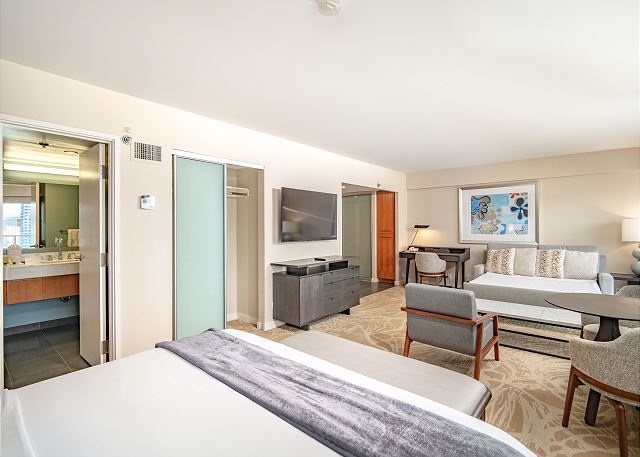 1 ベッドルーム - for 2 名様 (最大 4)30泊あたり $4,470 ~ $8,070 (税別) ホノルル市郡宿泊条例により最低宿泊数30泊ワイキキバニアンタワーⅡの高層フロア32階の改装済みマウンテンビューの1ベッドルーム1バスのバケーションレンタル。49.5㎡の室内は、シンプルでモダンにリモデルされました。室内には、キングサイズベッド1台とクィーンサイズのソファベッド1台が設置されています。日中は、高層階からのマウンテンビューと、夜はホノルルのシティライトをご覧頂けるレンタル。
