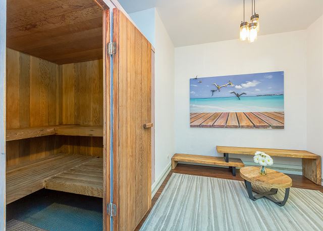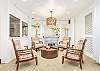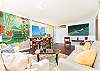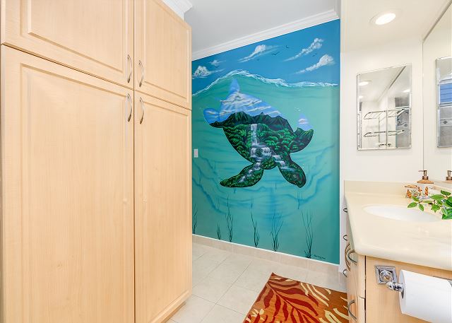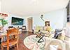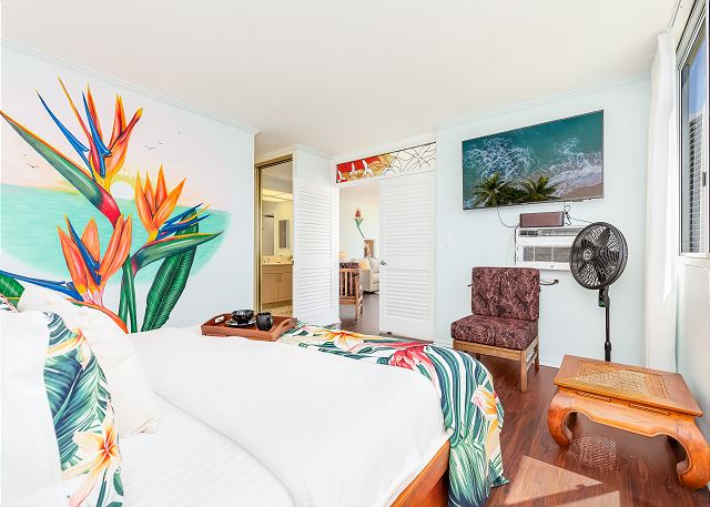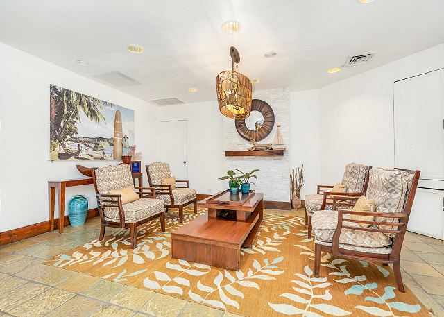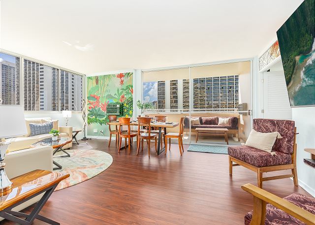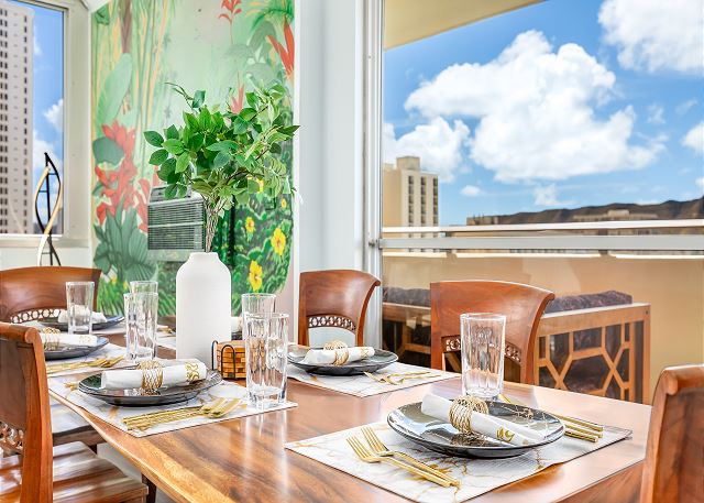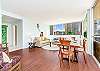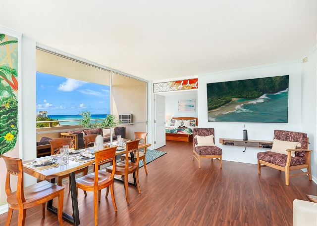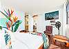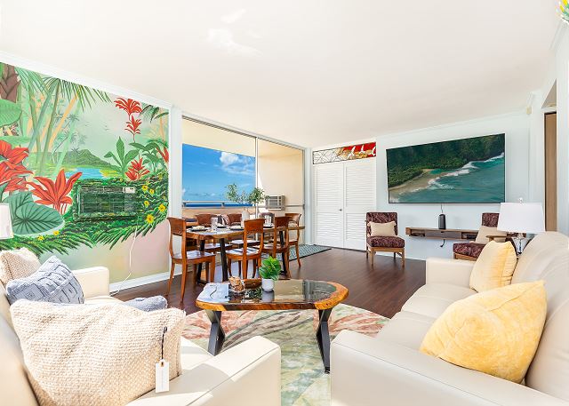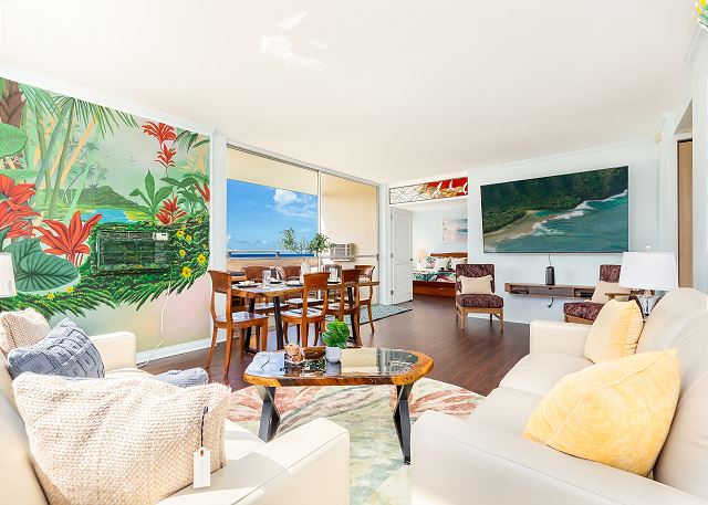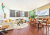 2ベッドルーム、2バスルームのユニットは、ハワイアンアートに彩られ、モンキーポットのダイニングテーブルやチーク材のチェアが、洗練された温かみを与えます。