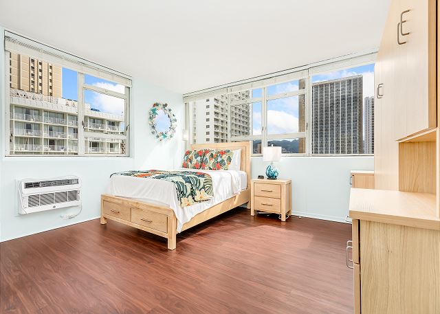 2 ベッドルーム - for 4 名様 (最大 6)30泊あたり $5,760 ~ $9,180 (税別) 宿泊条例により最低宿泊数30泊ワイキキ中心部にありクヒオ通りの裏に静かに佇むアロハタワーズは広々としたコンドミニアムです。改装されたの2ベッドルーム・2バスルームのコンドミニアムには洗濯機と乾燥機、フルキッチン、食洗機、エアコン、無料の高速インターネットが備わっており施設も充実しております。駐車場は一台分無料。中心部にあるロケーションのため非常に人気があります。リラックスして長期滞在を楽しむ事が出来ます。
