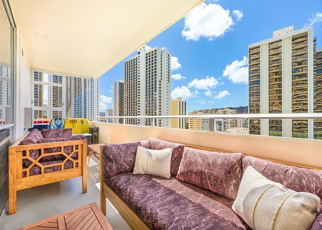 広々としたラナイでは、朝のコーヒーや夕方のカクテルタイムを絶景と共にお楽しみください。ビーチや一流レストラン、ショッピングスポットまで徒歩圏内の一等地。