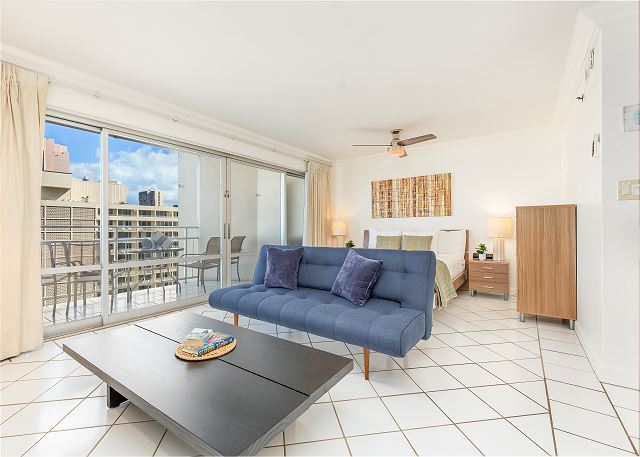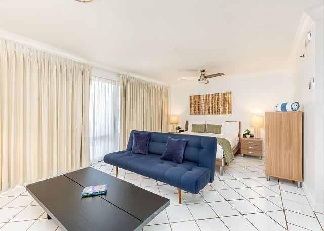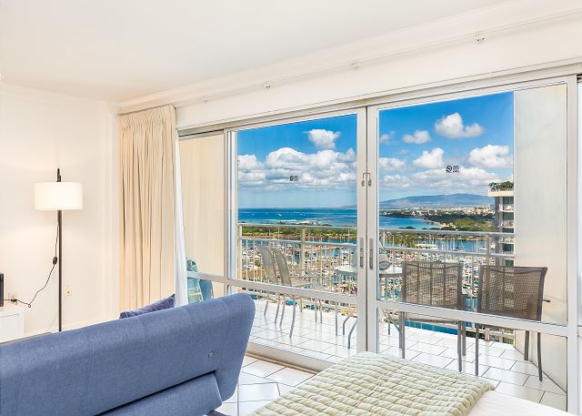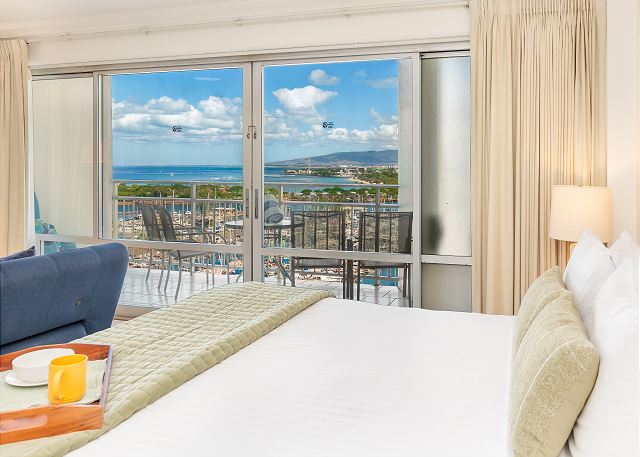 1 ベッドルーム - for 2 名様 (最大 3)1泊あたり $109 ~ $216 (税別) 最低宿泊数3泊9階、オーシャン/マリーナビューのオープンコンセプトのワンルームスタジオ・1バスのバケーションレンタル。広々としたラナイ、調理ができる簡易キッチン、エアコン、無料室内Wi-Fi付き。ベッド台数:キングベッド1台、ソファベッド1台