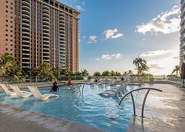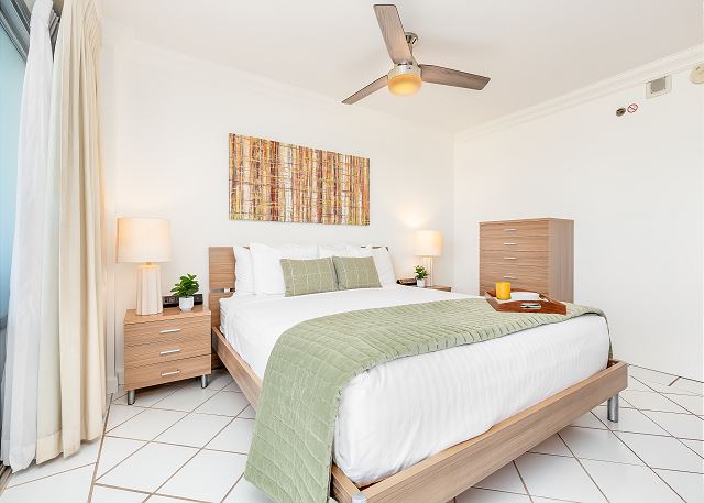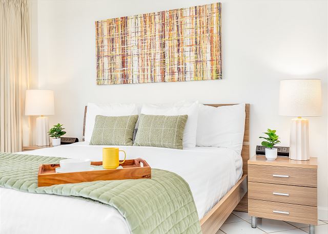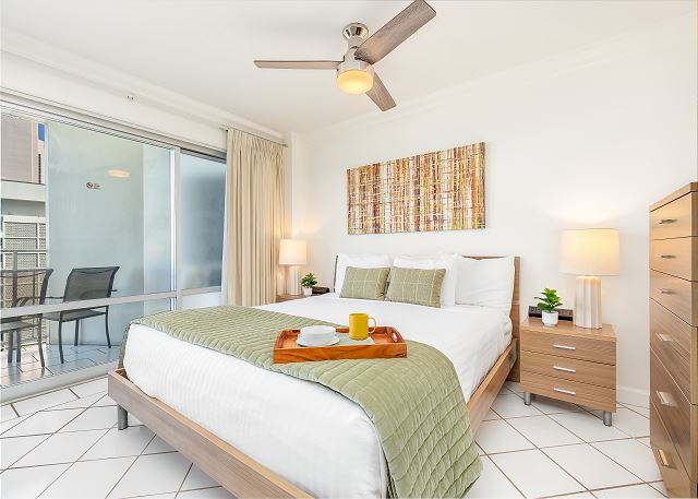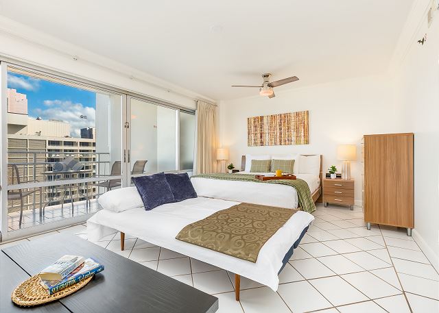 1 ベッドルーム - for 2 名様 (最大 4)1泊あたり $250 ~ $300 (税別) 最低宿泊数3泊美しいラグーンを目の前にした1ベッドルーム・1バスのこのユニットは、ラグーンビューがお楽しみ頂けます。キングサイズベッド1台、リビングにはソファー・ベッド1台の設置。無料室内Wi-Fi付き。ベッドルームとリビングルームの仕切りはスライディングドアになっています。ワイキキ キッチン付き宿泊、家族向け宿泊におススメです。
