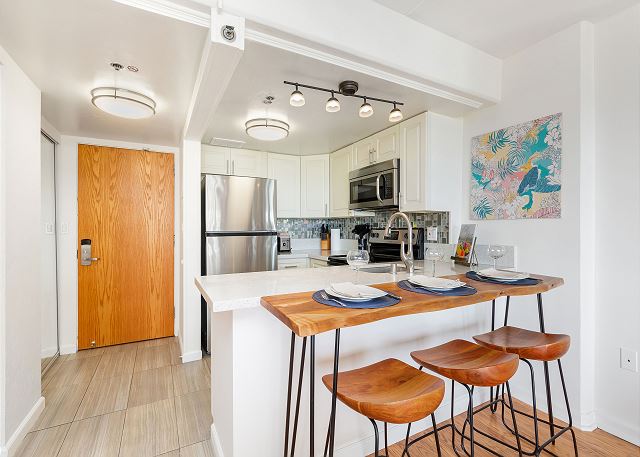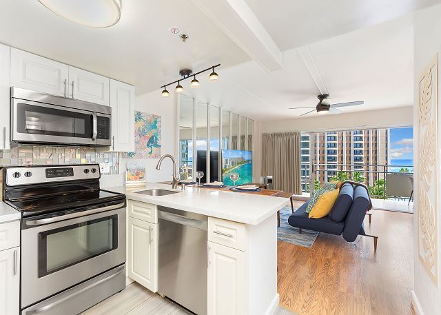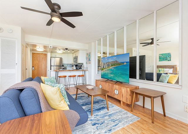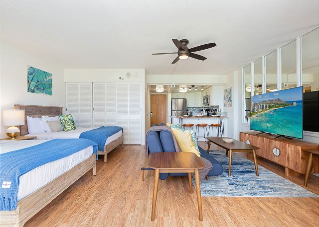 金曜の花火が見えるワイキキのバケーションレンタルをお探しなら、この一室があなたのハワイ旅を特別なものに変えてくれるはずです。 【お部屋の間取りについてお知らせ】法的には1ベッドルームタイプの間取りですが、リビングルームとベッドルームの仕切りをなくした改装をしているためスタジオタイプになっております。