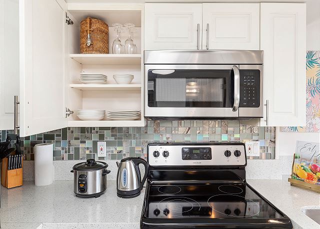 ・キチン家電完備(4口電気コンロ&オーブン、普通サイズ冷蔵庫、電子レンジ、コーヒーメーカー、食洗機、炊飯器、電気ポット)
