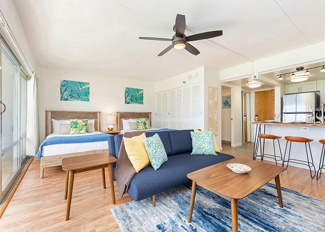 1 ベッドルーム - for 2 名様 (最大 4)1泊あたり $195 ~ $324 (税別) 最低宿泊数3泊ハワイリピーターに人気のコンドミニアム「イリカイ」のスタジオユニット。(リビングとの仕切りを外しているためスタジオとしております)全米No.1ビーチにも選出された、デュークカハナモクビーチパーク隣。アラモアナセンターやカカアコエリアへのアクセスも便利なロケーション。フルキッチン、エアコン、無料Wi-Fi付き、スマートTV付き。