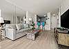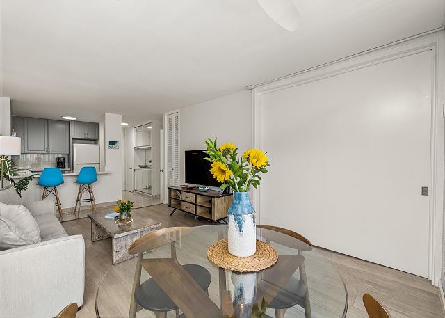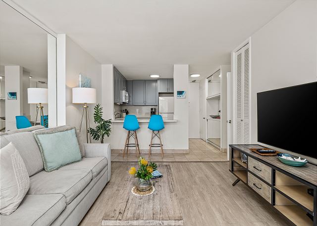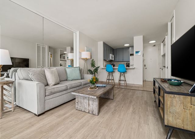 リビングルームの床は全面にナチュラルな木目のフローリングが施され、室内はセントラル・エアコンとシーリングファンが設置されており、快適なハワイステイを過ごせます。