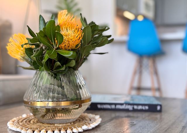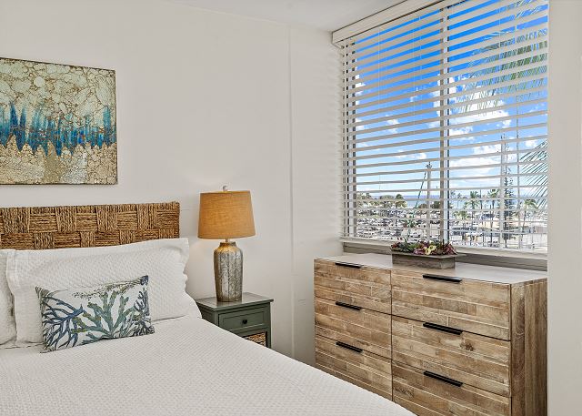 イリカイマリーナの1ベッドルーム1バスのバケーションレンタル。オーガニックな雰囲気のある木目調の家具と、アクセントカラーにブルーが使われたマリン・スタイルのお部屋です。お部屋からハワイらしい海とヨットハーバーの景色が見渡せ、夕方はサンセットの景色が楽しめます。