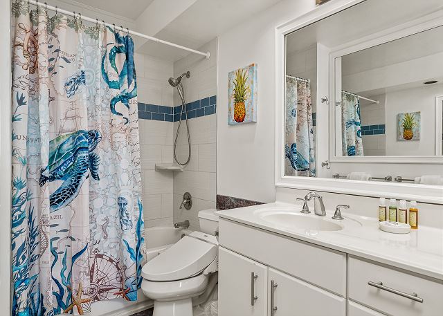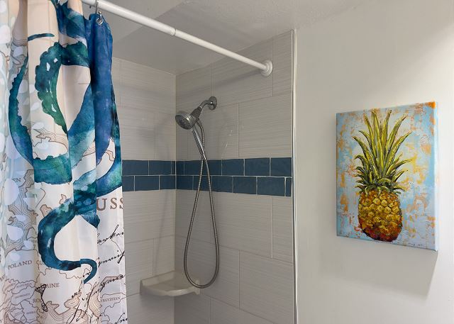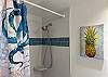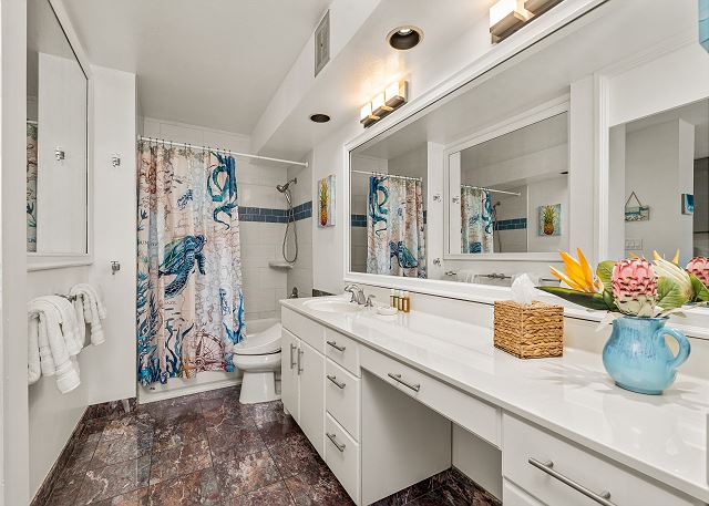 フルキッチン、ラナイ、フラットスクリーンTV、バスタブ、ハンドシャワー、温水洗浄便座、無料Wi-Fi完備。リビングルームのソファーは、クィーンサイズのソファベッドとしても利用可能で、ベッド・ルームにはキングサイズのベッドが1台有ります。