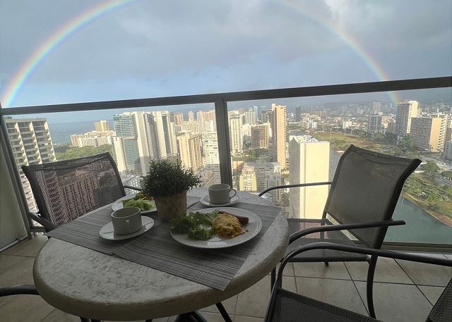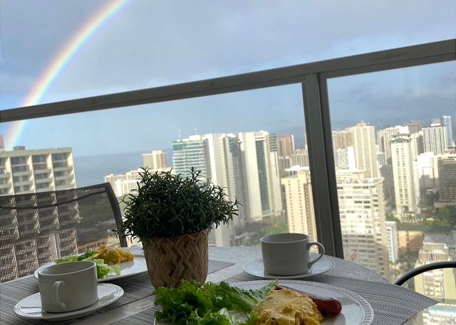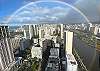 高層階43階/ ダイヤモンドヘッド&パーシャルオーシャンビュー/ ワンルームスタジオ・1バス / 簡易キッチン / 室内無料Wi-Fi/ 温水洗浄便座/ ラナイ / エアコン/ プール/ BBQエリア 完備。最低宿泊数2泊より可能 *