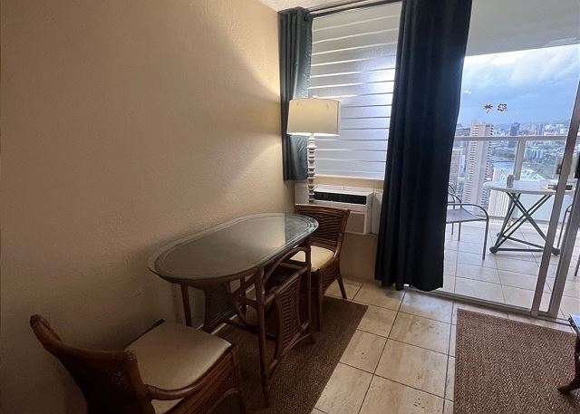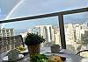 アイランドコロニー 4412号室(最低宿泊数2泊)最上階44階ペントハウス、ラタン家具が設置された落ち着いた雰囲気のお部屋です。ラナイからは、海・山・サンセット、金曜日の夜はヒルトンホテルでの花火がご覧いただけます。最上階からの眺めはまさに絶景です。小さめのキチネットは簡単なお料理ができる設備が整っています。絶景を前に朝のコーヒータイム、夕方からはワインを、そんな素敵なシーンがいつまでも思い出に残ることでしょう。カップル、小家族、お友達同士の長めのご滞在には最適です。