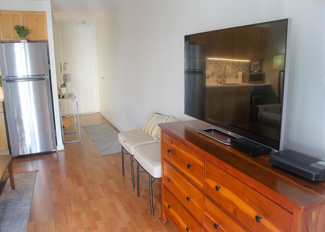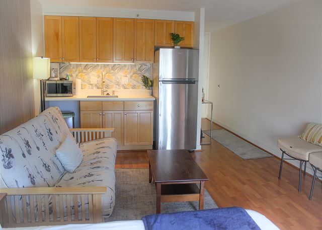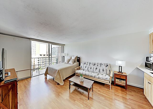 スタジオ - for 2 名様 (最大 2)1泊あたり $99 ~ $159 (税別) 最低宿泊数3泊21階シティビュー&パーシャルオーシャンビューのワンルームスタジオ・1バスルーム。コンパクトなフルキッチン、ラナイ、エアコン&シーリングファン、温水洗浄便座、無料室内Wi-Fi付き。ベッド台数:キングサイズのベッド1台、ソファベッド。