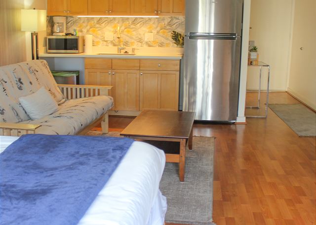 スタジオ - for 2 名様 (最大 2)1泊あたり $135 ~ $224 (税別) 最低宿泊数3泊スタジオタイプのワンルームレンタル。最近リモデルされたこの部屋は清潔感溢れる板張りのユニット。エアコン、小さめのフルキッチン、無料Wi-Fi、無料駐車場。クイーンサイズベッド2台。
