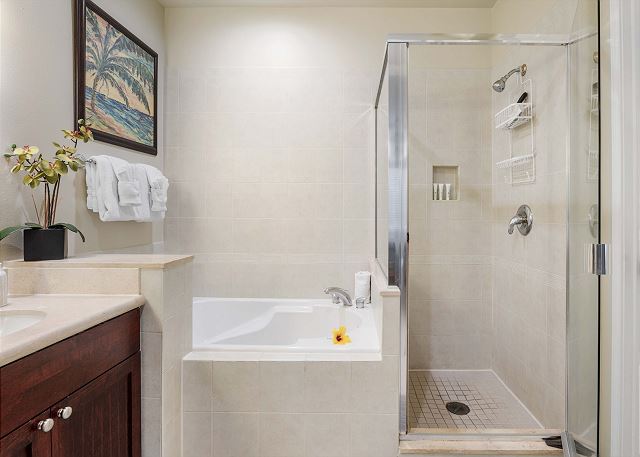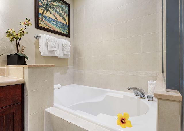 2 ベッドルーム - for 4 名様 (最大 6)1泊あたり $149 ~ $349 (税別) 最低宿泊数4泊2ベッドルーム、2バスのユニットです。クイーン&キングス・ショップスへのアクセスも便利なロケーションのヴィラタイプのコンドミニアム。2024年に新たなフローリングになりました。 2つのバスルーム共にそれぞれバスタブが付いているのが人気の秘密。嬉しいプライベートBBQグリル付き。 ベッドタイプ: キングサイズベッド1台、クイーンサイズベッド1台