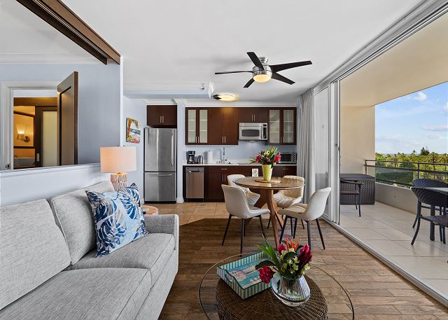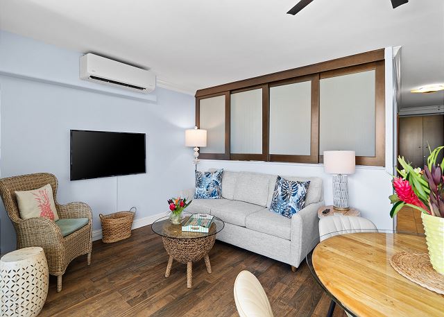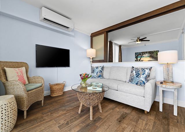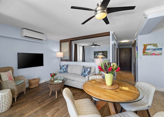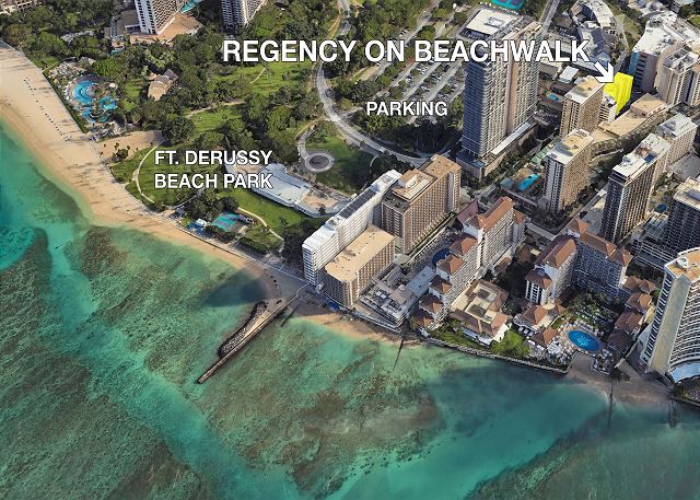 そのリージェンシーオンビーチウォーク コンドミニアムの2ベッドルーム、1バスルームの角部屋です。64.4㎡(693 ft2)のお部屋には二つのラナイが付いています。金曜日の夜は、表のラナイで冷たい飲み物を片手に有名ホテルの花火をお楽しみいただけます。★ 360°バーチャルツアー は、ここをクリック!