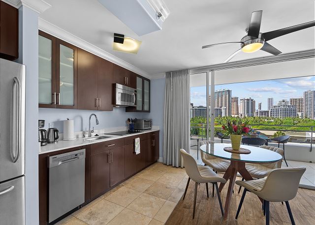 2 ベッドルーム - for 4 名様 (最大 6)1泊あたり $248 ~ $519 (税別) 最低宿泊数3泊ワイキキの砂浜まで徒歩約3分、ハワイを楽しむには最高の立地条件。ワイキキの海のすぐ裏通りにある静かな佇まいのコンドミニアム。リゾートの雰囲気で纏められたモダンでおしゃれな2ベッドルーム。大きなラナイ付き。エアコン、温水洗浄便座、無料Wi-Fi、フルに設備の整ったデザイナー・キッチン。駐車場は近くの施設を無料でご利用いただけます。