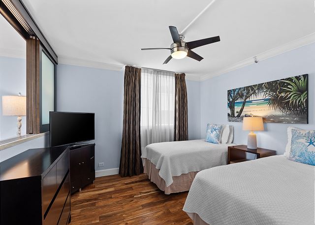 2 ベッドルーム - for 4 名様 (最大 6)1泊あたり $248 ~ $524 (税別) 最低宿泊数3泊ワイキキビーチまで徒歩約3分、カラカウア通りまで1ブロックの便利な立地が人気のリージェンシーオンビーチウォーク7階の2ベッドルーム1バスのバケーションレンタル。金曜の夜は、ヒルトンの花火をラナイからご覧いただけます。エアコン、温水洗浄便座、無料Wi-Fi、設備の整ったフルキッチン付き。駐車場は徒歩5分の施設を無料でご利用いただけます。室内には、クィーンサイズベッド1台、ツインサイズベッド2台、クィーンサイズのソファベッドが1台設置されています。