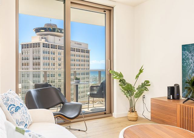 大きな窓からは、ホノルルの街並み、そして西オアフ島の山々のビューを一望でき、都会と自然が融合した景色が望ます。