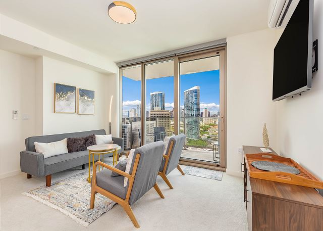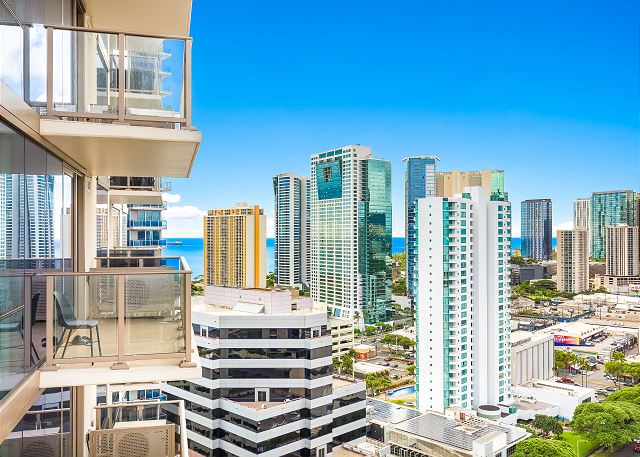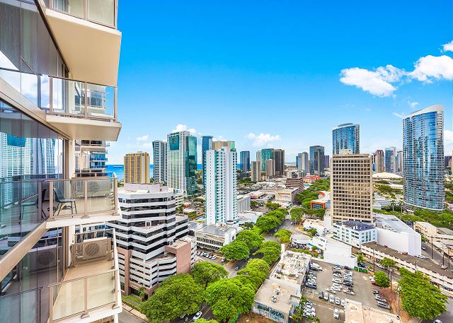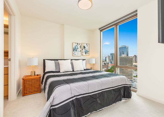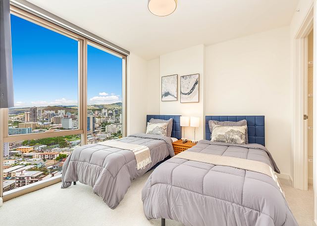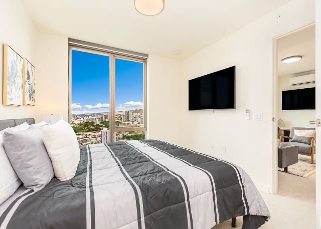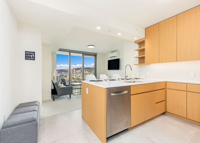 スカイ・アラモアナ(Sky Ala Moana) #2308 - 23階/ シティ&パーシャルオーシャン・マウンテンビュー/ 2ベッドルーム/ 2バス/ フルキッチン/ 無料Wi-Fi / 室内洗濯機&乾燥機 / 2023年に完成したアラモアナの高級コンドミニアム *