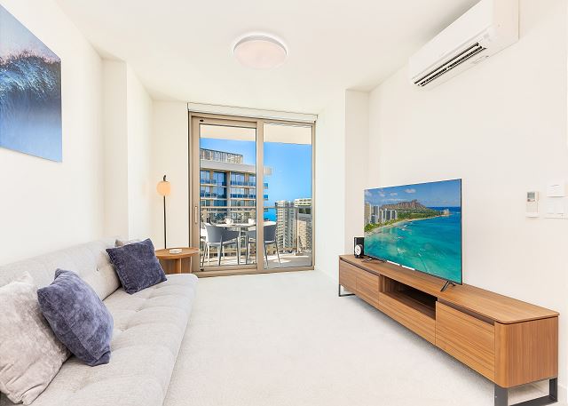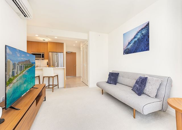 ハワイの中心地、アラモアナセンターの目の前に位置する『スカイ・アラモアナ』は、便利さと贅沢さを兼ね備えた理想的な滞在先です。41階ならではの床から天井までの大きな窓からは、ハワイの明るい自然光が差し込み、リビング全体を心地よく包み込みます。高層階ならではの開放感と眺望の中で、ゆったりとしたハワイ時間をお過ごしください。