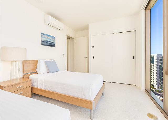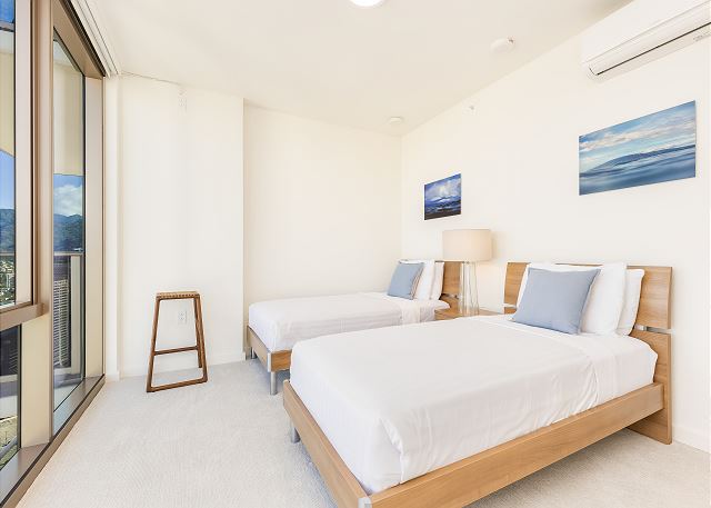 2 ベッドルーム - for 6 名様 (最大 6)30泊あたり $7,140 ~ $9,870 (税別) 宿泊条例により最低宿泊数30泊「スカイ・アラモアナ」アラモアナエリアの新たなシンボル。ビジネス、バケーションに人気のコンドミニアム。予約がすぐに埋まってしまいます。ハワイの自然と都会の融合が実現した快適な空間。心地よいラグジュアリー感が広がり、新しい時代のバケーションレンタルです。最大宿泊人数6名様まで。 ベッド台数:キングサイズベッド1台、ツインサイズベッド2台、ソファベッド1台