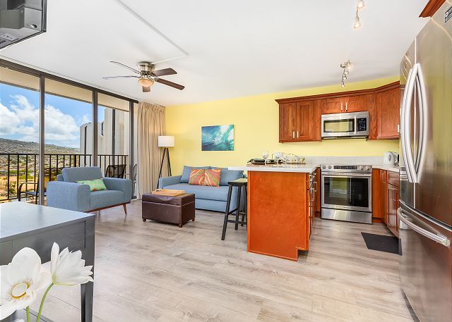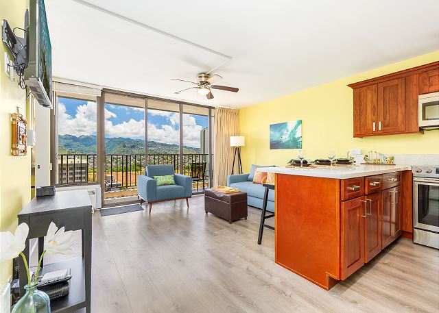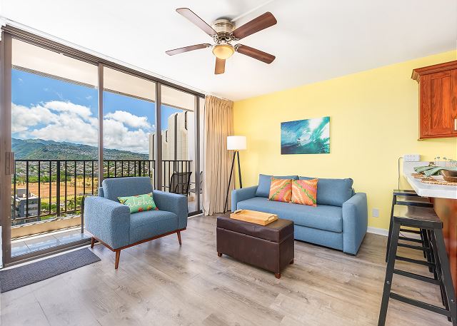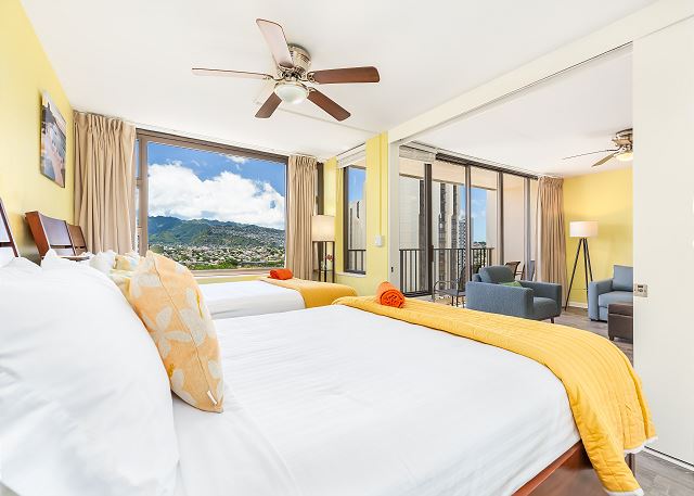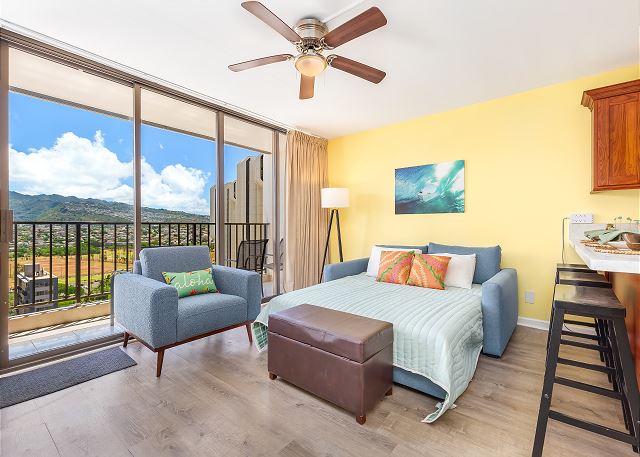 ワイキキ・バニアン (Waikiki Banyan) #1809-T2 - 18階/1ベッドルーム/ 1バス/ マウンテンビュー/ ベッド2台+ソファベッド1台の設置で便利なお部屋/ フルキッチン/ エアコン/ 室内無料Wi-Fi/ 無料駐車場1台付き *