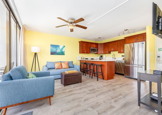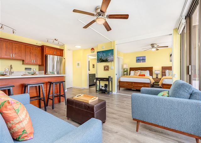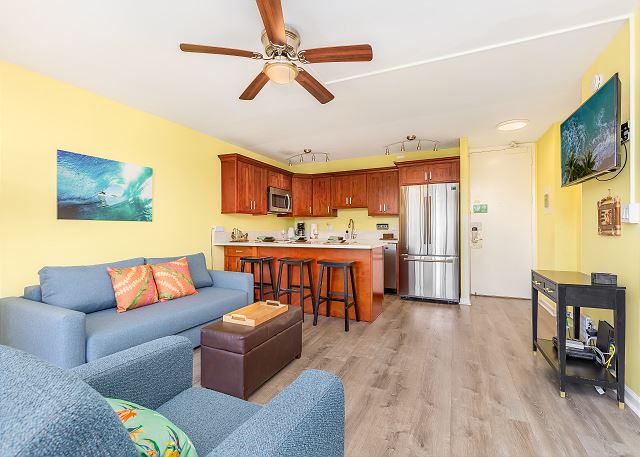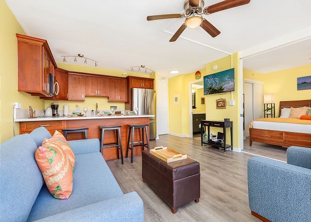 思わず笑顔になってしまう、ポップで明るい室内でリラックス。エアコン完備で、ハワイの暑さも気にならず快適に過ごせます。さらに無料Wi-Fiも利用できるので、ビジネスでもレジャーでも便利です。