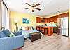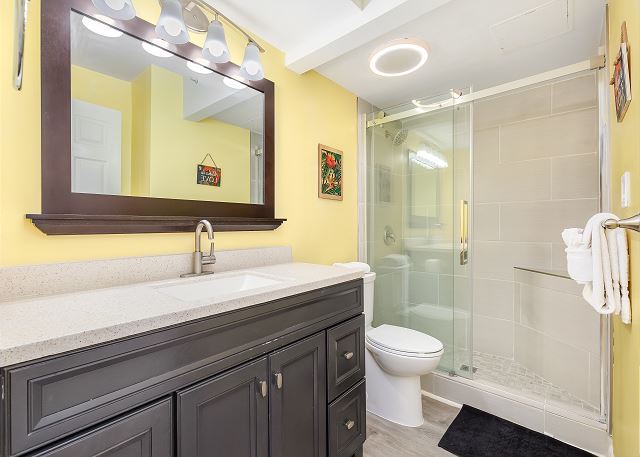 フルキッチンには、料理好きな方に嬉しい調理器具が揃っており、地元の新鮮な食材を使った自炊も可能です。広々としたバスルームは、ベッドルームとリビングルームの両方からアクセスできる便利な設計。プライバシーを保ちながらも使い勝手の良い空間が提供されています。