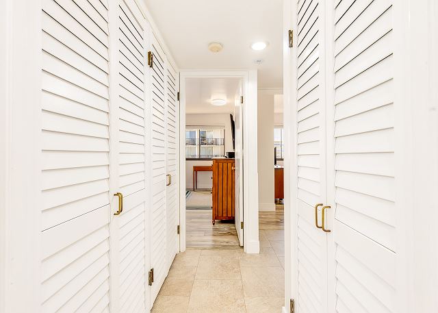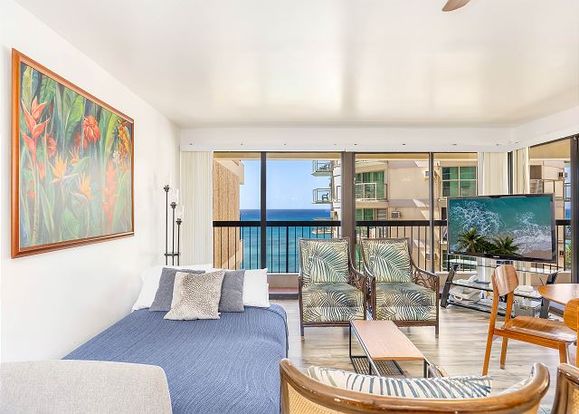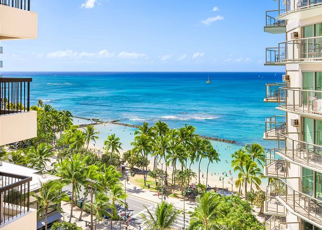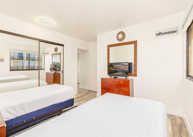 ワイキキ・ビーチ・タワーの向かいにはワイキキビーチが目の前のオーシャンフロントロケーション。ハワイの日差しの中で日光浴をして、暖かい砂浜とサーフィンを楽しんだり、この2ベッドルーム・2バスのコンドミニアムの広々としたラナイから美しいターコイズブルーの波を眺めたり、最高のハワイ旅行を楽しめるバケーションレンタルです。こちらのコンドミニアムでは、オーシャンビューの眺め、フルサイズのキッチン、プライベートラナイ、室内に洗濯・乾燥機が設置されています。マスターベッドルームにはキングサイズのベッド、もう一つのベッドルームにはツインサイズのベッドが2台、リビングルームにはクイーンサイズのソファベッドが備わっています。
