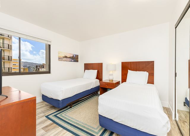 2 ベッドルーム - for 4 名様 (最大 6)1泊あたり $447 ~ $804 (税別) 最低宿泊数3泊高層フロア23階、95平米の広々とした2ベッドルーム2バスのレンタル。ラナイからのダイヤモンドヘッド・ビューとパノラミックなオーシャンビューをお楽しみください。室内のグルメ・キッチンには、調理に必要なものすべてがそろっています。セントラル・エアコン、無料Wi-Fi、無料バレーパーキング1台分付き。