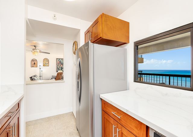 18階/ 2ベッドルーム/ 2バス/ すばらしいオーシャンビュー/ フルキッチン / ラナイ / エアコン / 室内洗濯機・乾燥機/ 室内無料Wi-Fi/ プール /BBQエリア完備 / 無料バレーパーキング1台分付き *