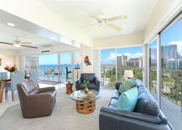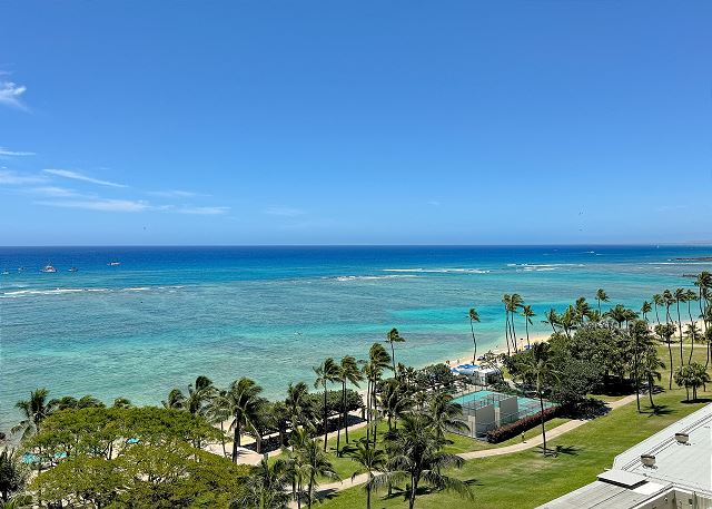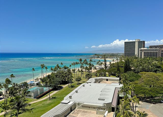 オンライン上予約は承諾待ちのリクエストとして取り扱われます。ワイキキショア14階 角部屋の2ベッドルーム/2バス。フルキッチン、室内洗濯機・乾燥機、無料Wi-Fiあり。ラナイからは素晴らしいオーシャンビュー、フォート・デルッシー・ビーチパークの緑、コオラウ山脈のパノラミックビュー。