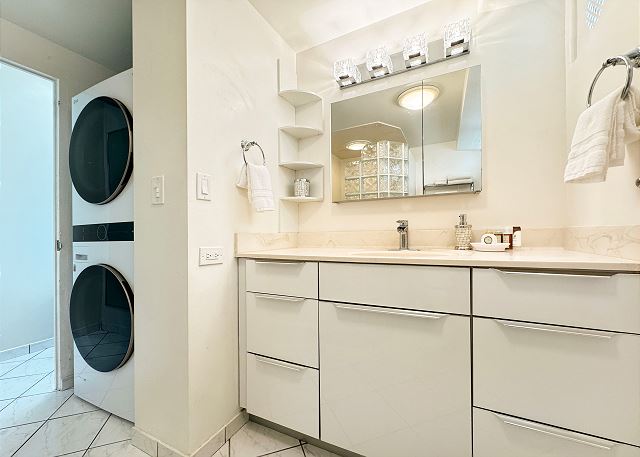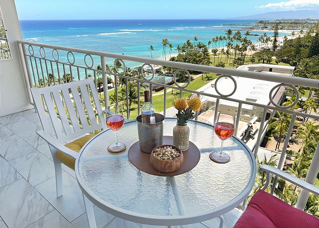 9階 角部屋 / 2ベッド・ 2バス/ 豪華なオーシャンフロントビュー/ フルキッチン/ ラナイ / バスタブ/ 温水洗浄便座/ 室内洗濯機&乾燥機 / 室内無料Wi-Fi / 1台無料駐車場付き *