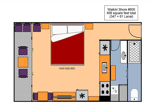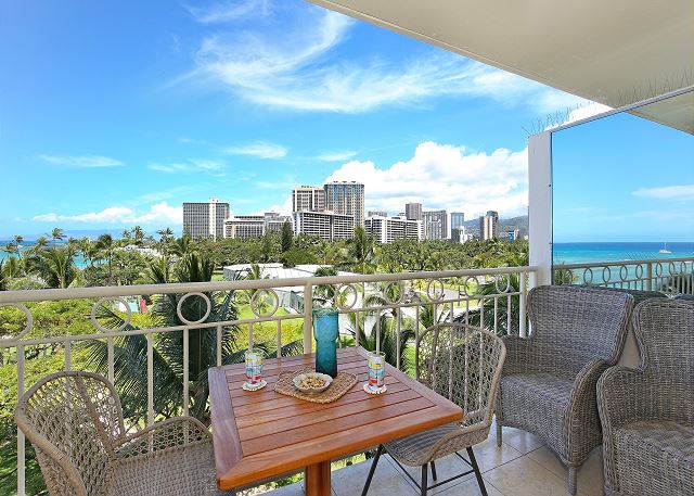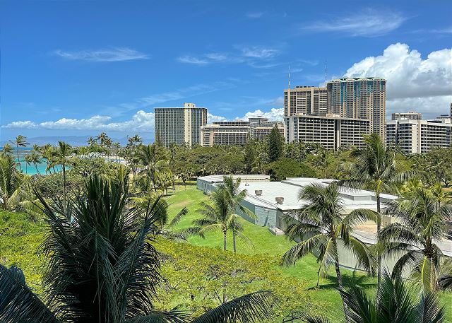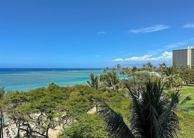 ワイキキ・ショア (Waikiki Shore) #605 - 6階/ パーシャルオーシャンビュー/ スタジオタイプ・1バス / フルキッチン /ラナイ / エアコン / 無料室内Wi-Fi / 温水洗浄便座付き/ 室内洗濯機&乾燥機 *