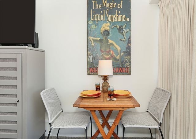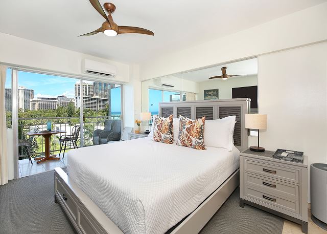 スタジオ - for 2 名様 (最大 2)1泊あたり $233 ~ $369 (税別) 最低宿泊数3泊2023年にリノベーション済みでプライベートラナイから、ワイキキビーチと美しいサンセットが眺められるスタジオタイプのお部屋。リピーターがお気に入り。 フルキッチン、エアコン、無料Wi-Fi付。