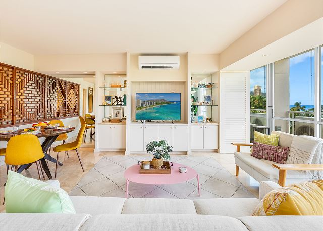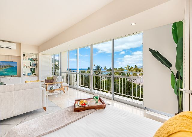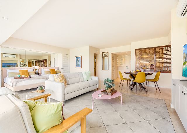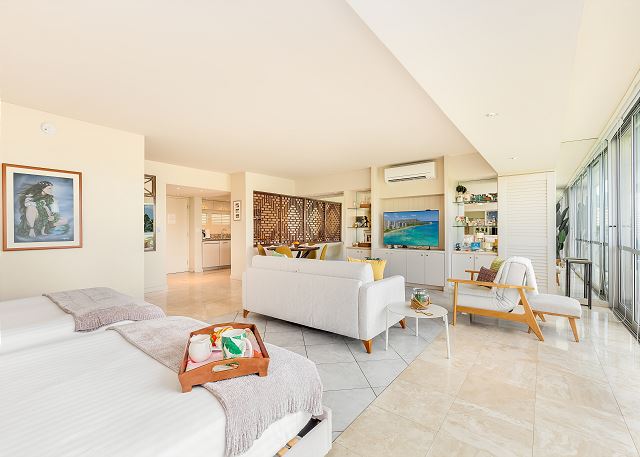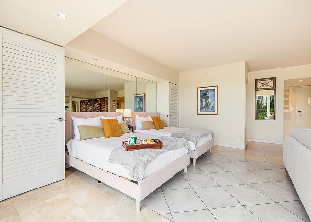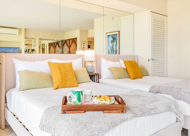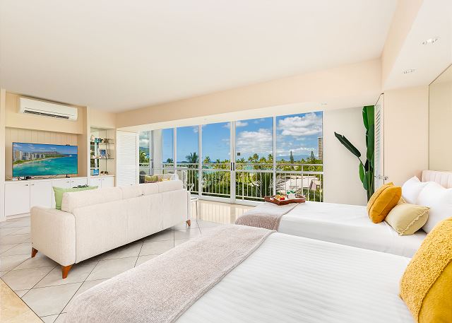 1 ベッドルーム - for 2 名様 (最大 4)1泊あたり $258 ~ $489 (税別) 最低宿泊数3泊素晴らしいオーシャンビューとコオラウ山脈のマウンテンビューがご覧頂ける改装済みのお部屋。広々とデザインされたコンドミニアムからは、緑の山並み、遠くはエバビーチそして青いパシフィック・オーシャンの海原を一望します。室内には、キングサイズベッド1台とフルサイズのソファーベッドが設置され、最大4名まで宿泊可。42インチのテレビ、フルキッチン、ハンドシャワー、温水洗浄便座、室内洗濯機&乾燥機完備。オーナーのテイストあふれる人気の有るレンタルです。無料Wi-Fi付き