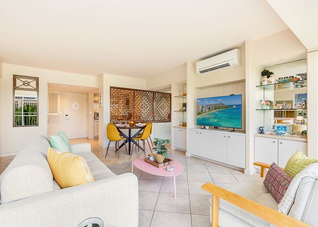 ワイキキで唯一オン・ザ・ビーチのコンドミニアム”ワイキキショア”。6階に位置するこちらワンベッドルームのユニットは、新しく家具を入れ替え、モダンアジアンテイストにハワイらしいティキスタイルとオーナメントをアクセントにしたおしゃれなデザインです。お部屋の側面が大きな窓になっているので、とても明るい印象です。設備の整った清潔なフルキッチンでは、いつでもクッキングをお楽しみ頂けます。洗濯機と乾燥機がありますので、スケジュールに合わせて時間を有効にお使いいただけます。ワイキキビーチが大好きなご家族、お友達同士にピッタリのバケーションレンタルです。