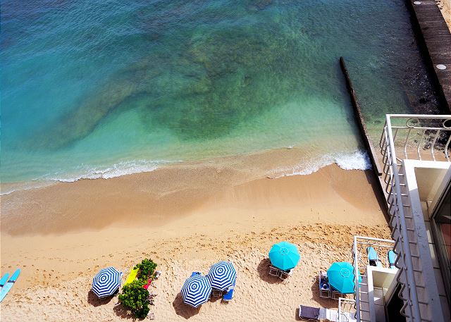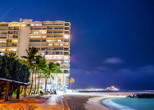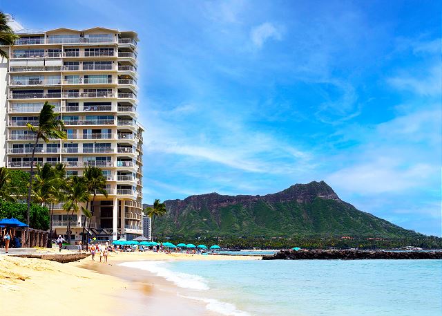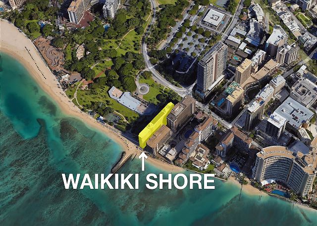 ワイキキビーチが目の前のコンドミニアム「ワイキキ・ショア」は、静かな佇まいにもかかわらず、コンドミニアムから一歩出ると、そこには世界に有名なワイキキビーチが目の前にあり、ビーチへのアクセスはもちろん、有名なホテル・レストランへのアクセスにも便利なロケーションです。