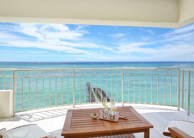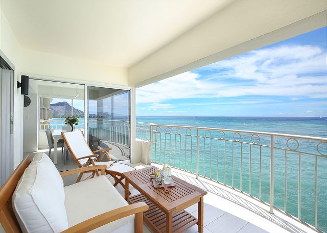 ワイキキショア 700号室(最低宿泊数3泊)贅沢なオーシャンフロントの7階角部屋2ベッドルーム・2バスのバケーションレンタル。設備の整ったフルキッチン、オーシャンフロントビューの広々としたラナイ、スプリットタイプのエアコン、バスタブ、便利な室内洗濯機・乾燥機、嬉しい温水洗浄便座、無料駐車場1台分が付いており、ベッドルームにはキングベッド1台ずつが備え付けられております。ご宿泊の人数によって、無料でツインサイズのローラウェイベッドを2台まで入れることも可能です。ビーチフロントの広々としたラナイで、ワイキキ内で最高クラスとも言えるオーシャンビューを楽しみながら、ゆったりとした贅沢なハワイステイをお過ごしいただけます。
